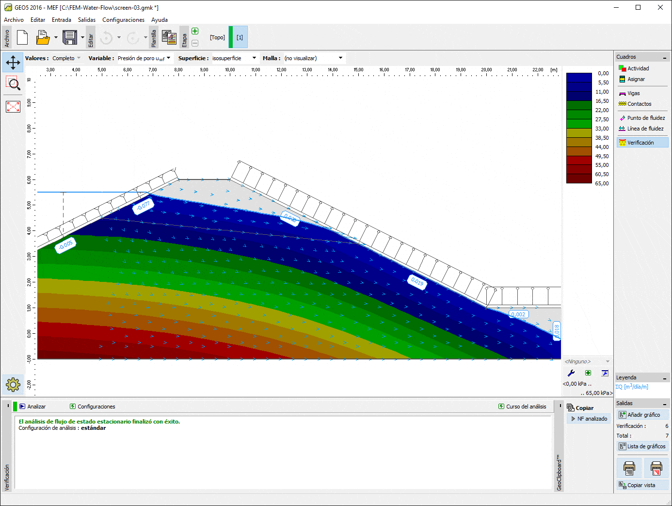 - Representación lúcida de la distribución de la presión de poros, de las velocidades de flujo y del nivel freático